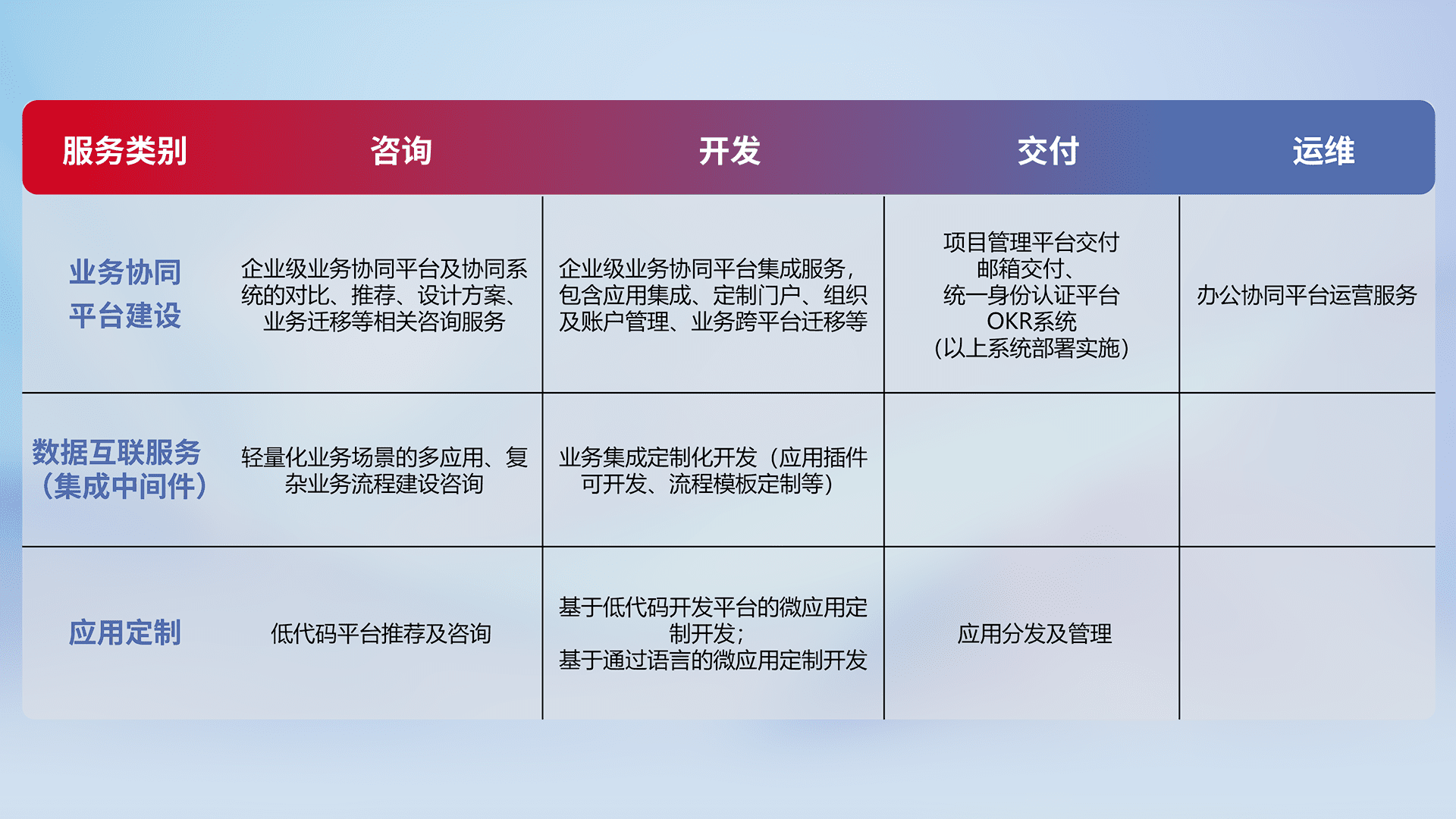 针对钉钉、、、、企微、、、、IDaas等平台级产品提供产品的规划、、方案、、、交付、、、、定制化开发等服务,,,实现如统一协同办公、、、、智能客户服务、、、混合会议管理、、、智能数据查询、、、、等业务场景,,,,实现数字化转型。。。